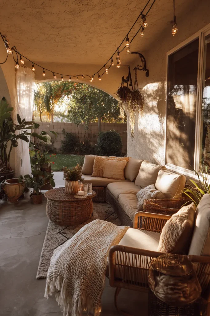 This lovely covered patio creates a light and airy California-inspired lounge with its soft, warm colors and abundance of natural materials. A cozy, upholstered sectional sofa is paired with stylish woven rattan armchairs and a round wicker coffee table, all centered on a textured, light-patterned rug. The entire look is bathed in a sunny glow, with string lights overhead and sheer white curtains adding a soft, breezy, almost romantic feel to the arched patio entrance.