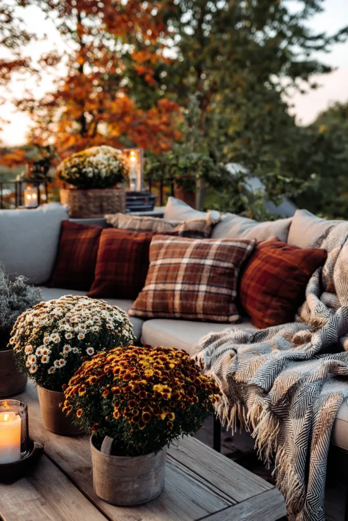 I just adore how perfectly this space transitions from summer to fall—it’s seriously the definition of cozy season outdoors! The way the plaid pillows instantly give it that chic farmhouse vibe is so smart, and the little pots of flowers add such a lovely, colorful texture to the foreground. This looks like the ultimate spot for sipping a pumpkin spice latte and enjoying the gorgeous colors of the changing leaves, and it’s truly so welcoming.