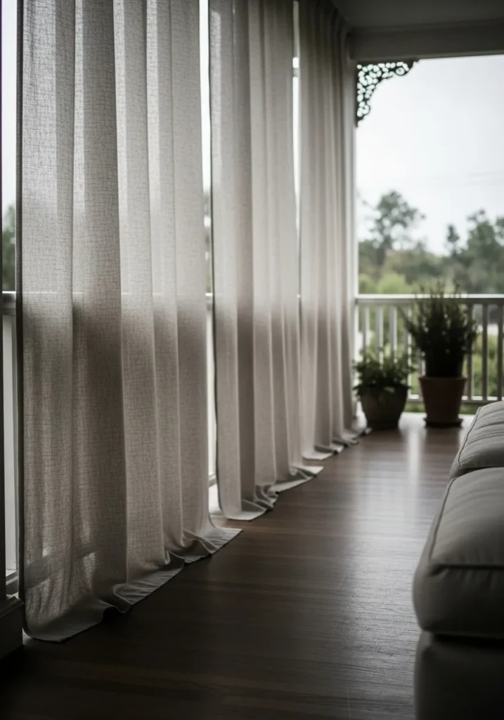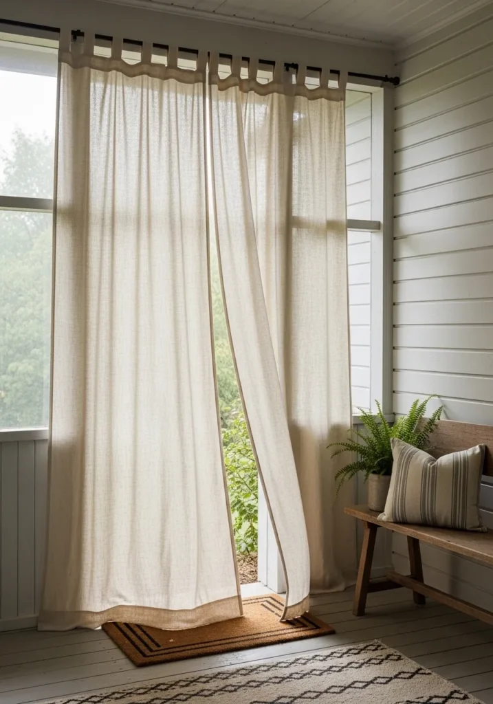 Lightweight sheer curtains hang loosely from a simple rod and softly frame the porch opening while letting daylight filter through. The fabric feels airy and semi transparent which adds privacy without blocking the view, and the light wood flooring paired with neutral tones keeps the whole space calm and breezy.