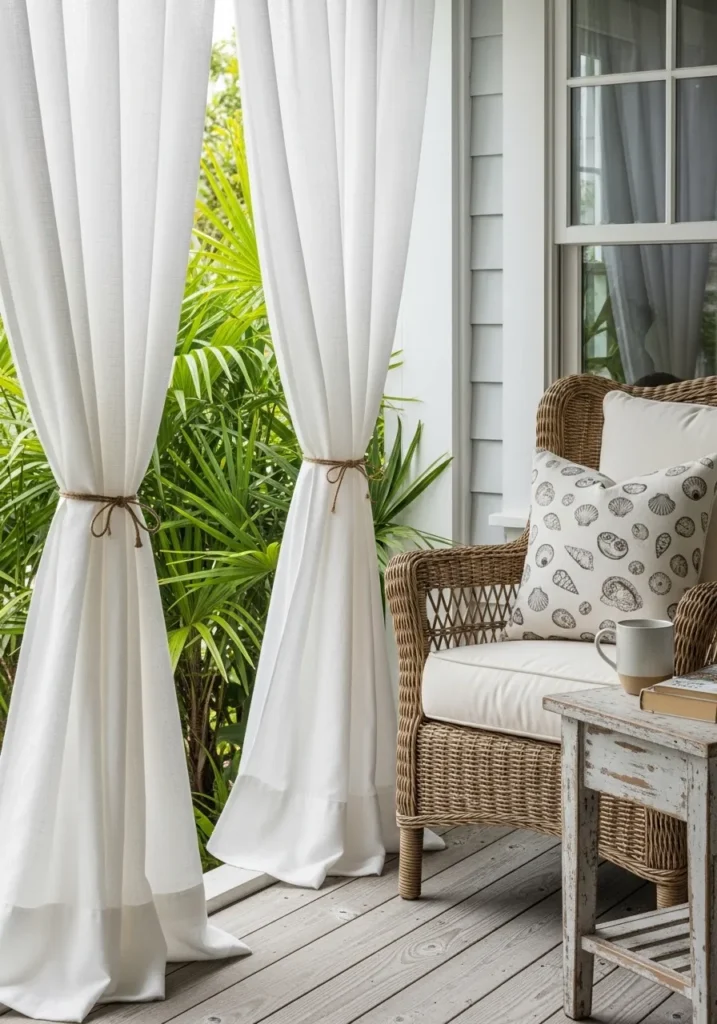 White curtains are pulled back with simple ties to frame a cozy seating area near the porch edge. Natural textures like wicker furniture and greenery bring warmth while the curtains soften the surrounding structure.