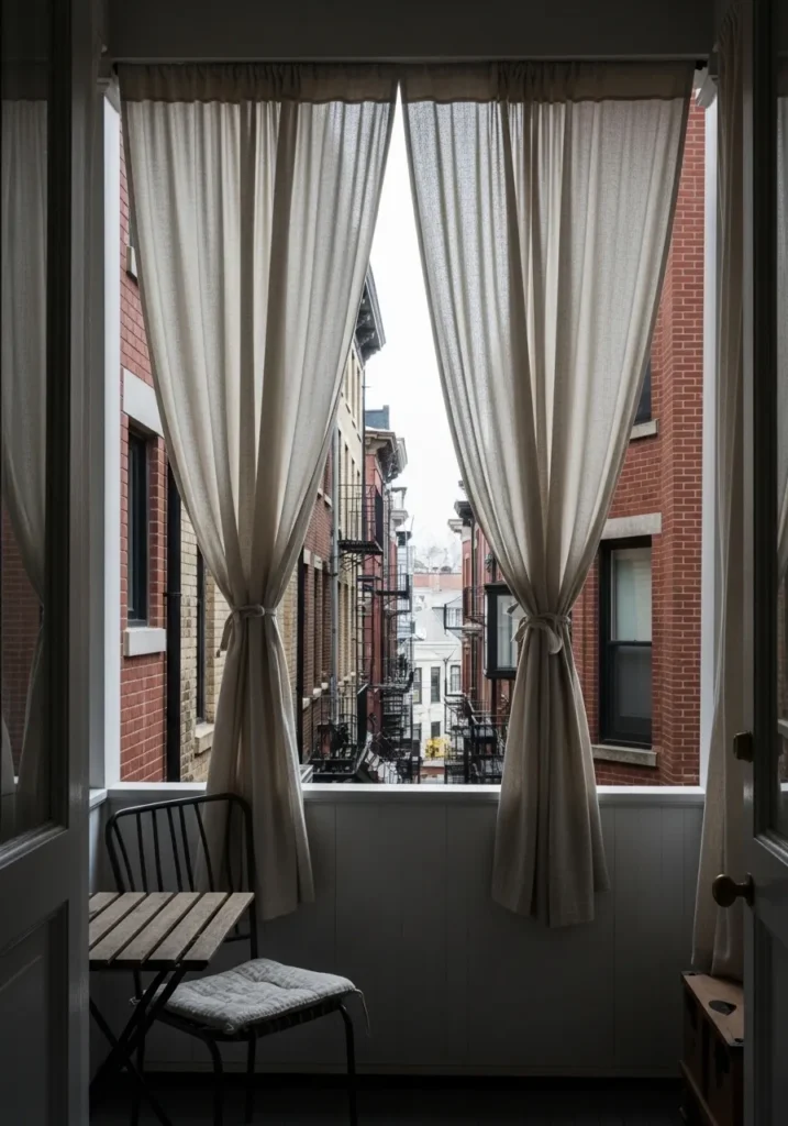 Neutral toned curtains hang straight and clean against a brick backdrop and add privacy from nearby buildings. The fabric softens the urban setting and helps the porch feel more personal and calm despite the busy surroundings.