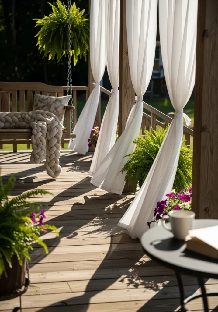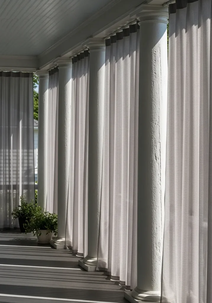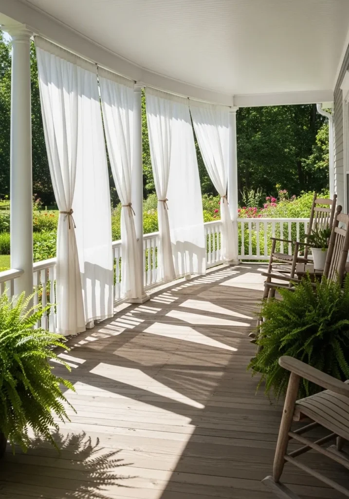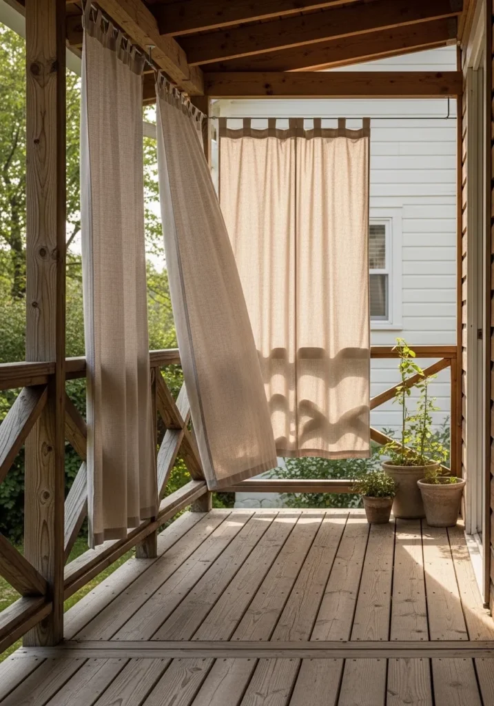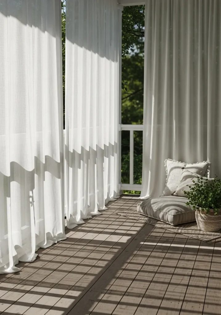 Long white curtains fall straight to the floor and line the edge of the porch with a clean and simple look. Sunlight creates subtle shadows across the floor while the fabric adds privacy without blocking the open feeling of the space.