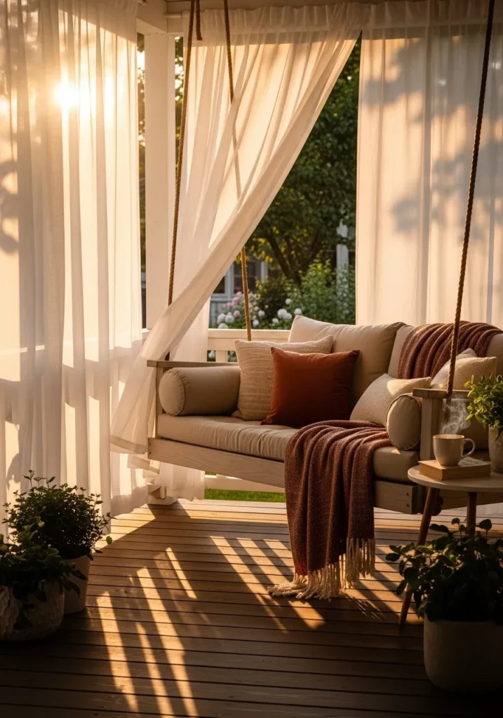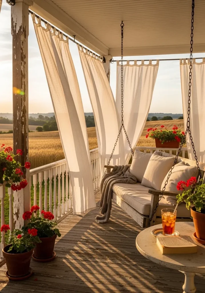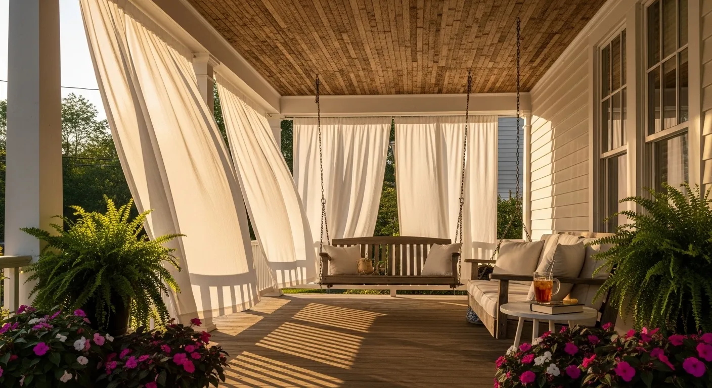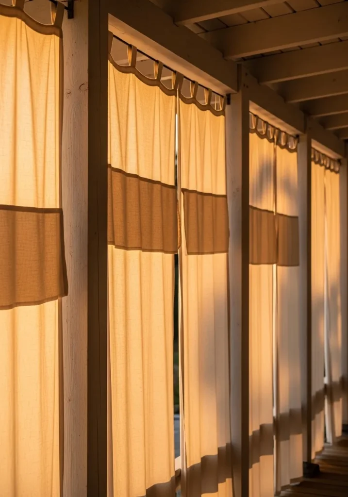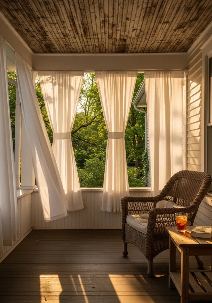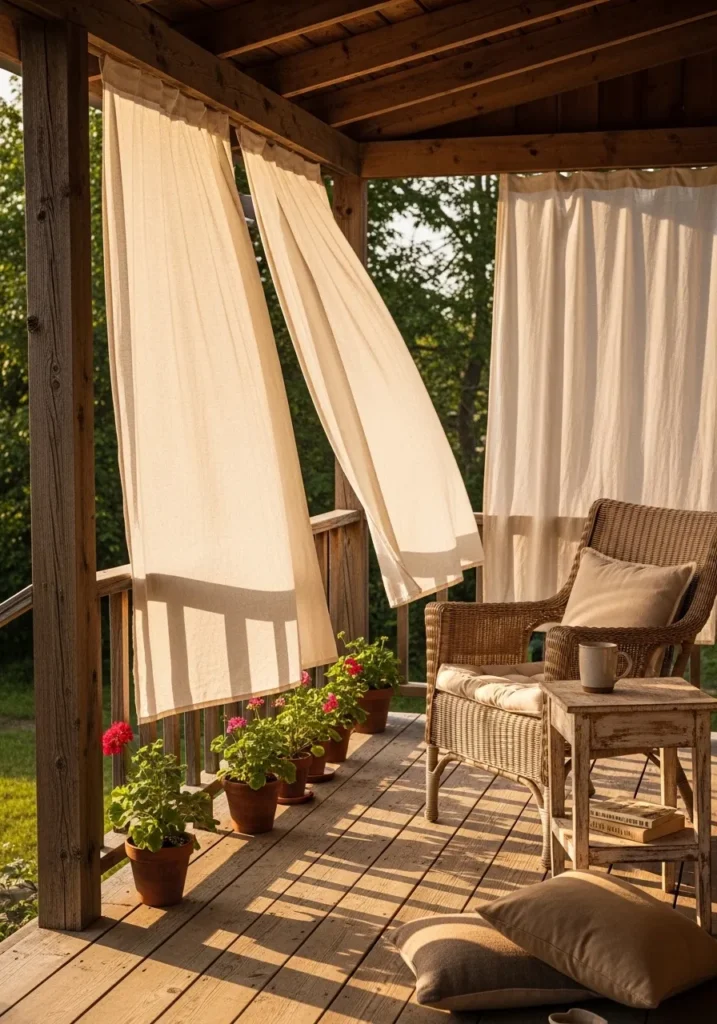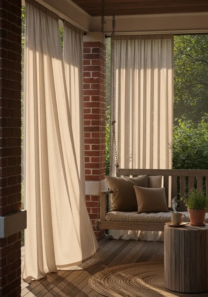Thicker curtain panels in warm tones line the porch wall and create a cozy sense of enclosure. Light filtering through the fabric adds a soft glow that works beautifully with wood details and simple hardware.