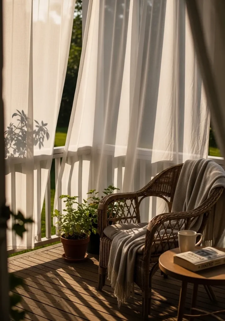 Curtains fall softly around a wicker chair and side table creating a private little nook. Natural textures like woven furniture and potted plants bring warmth while sunlight adds depth through gentle shadows.