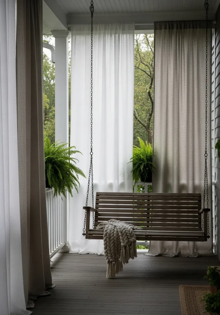 Sheer curtains hang around a porch swing and soften the structure of the space. The light fabric creates privacy while still allowing views of greenery beyond and keeping the porch bright and airy.