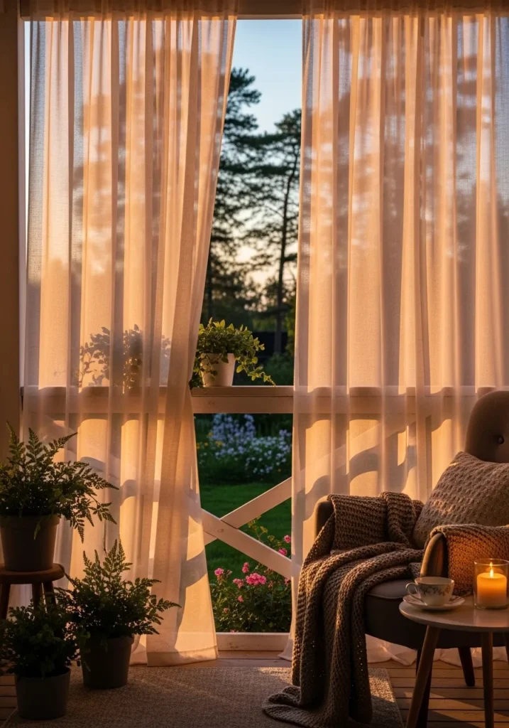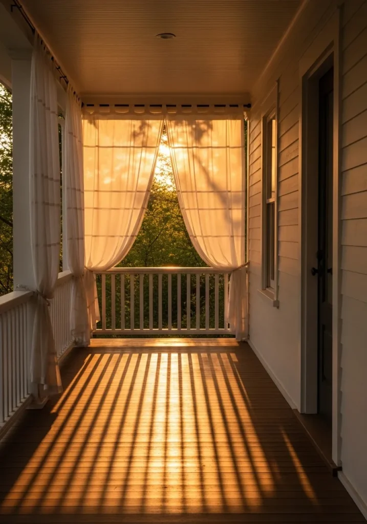 Light sheer curtains hang loosely and catch the warm colors of the setting sun, creating a cozy glow across the porch. The fabric softens the railing and frames the view while small plants and simple seating add a relaxed and welcoming feel.