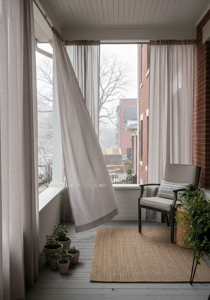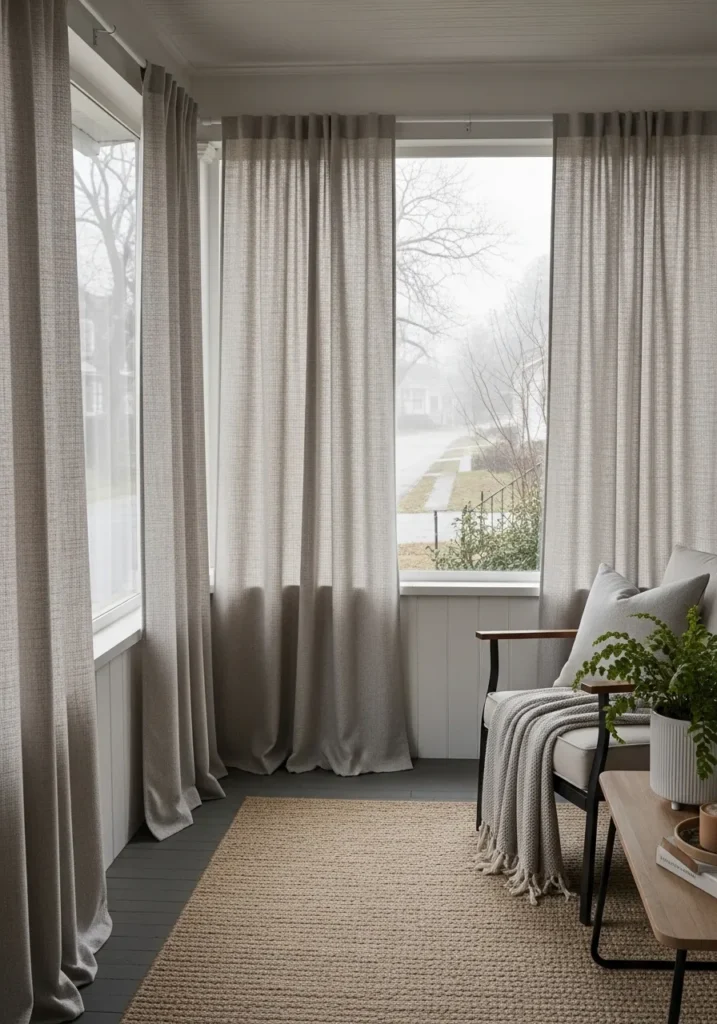 Neutral curtains fall neatly around the porch windows and create a calm and cozy enclosure. The soft fabric balances the light flooring and simple furniture while keeping the space bright and comfortable.
