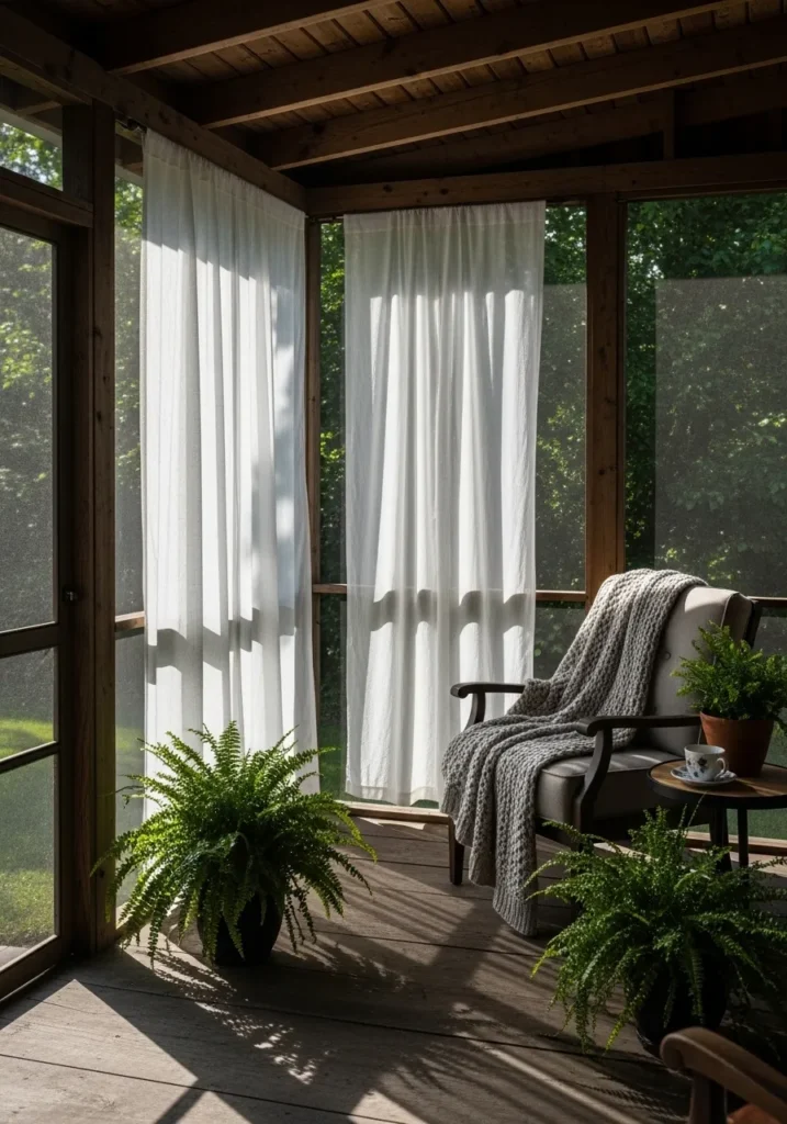 Sheer white curtains hang neatly between dark wood frames and create a gentle filter between the porch and the outdoors. The light fabric softens the structure of the screened porch while still letting greenery and daylight shine through, and the mix of plants and cozy seating keeps everything feeling calm and lived in.