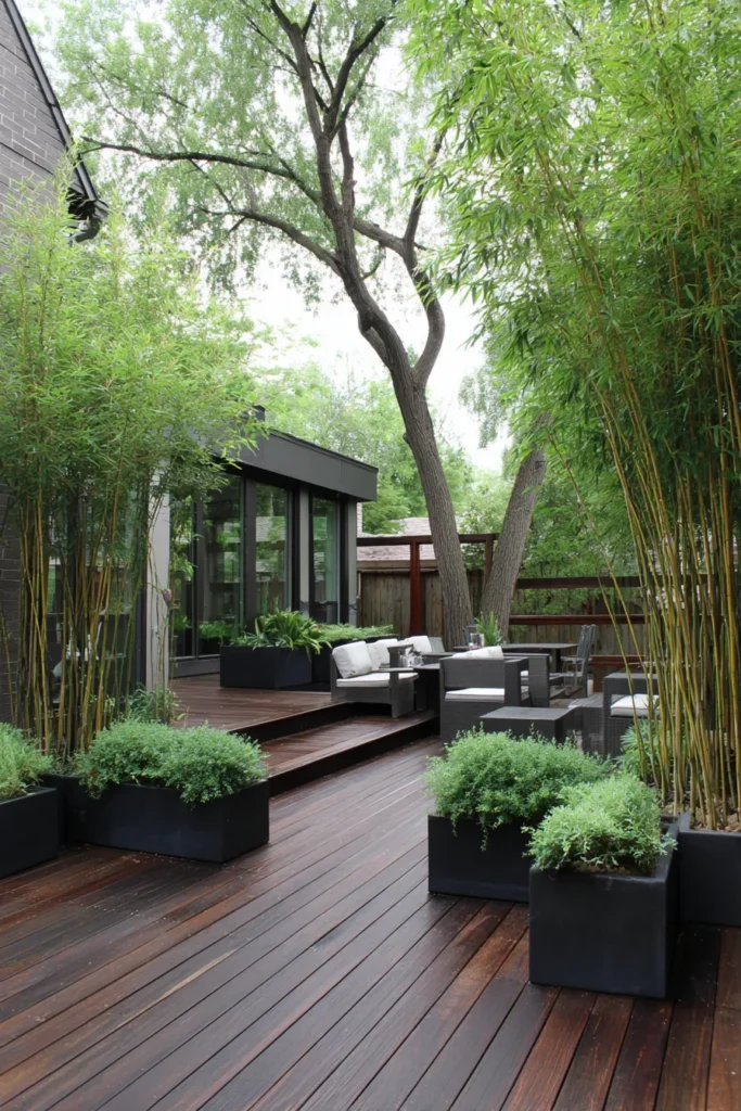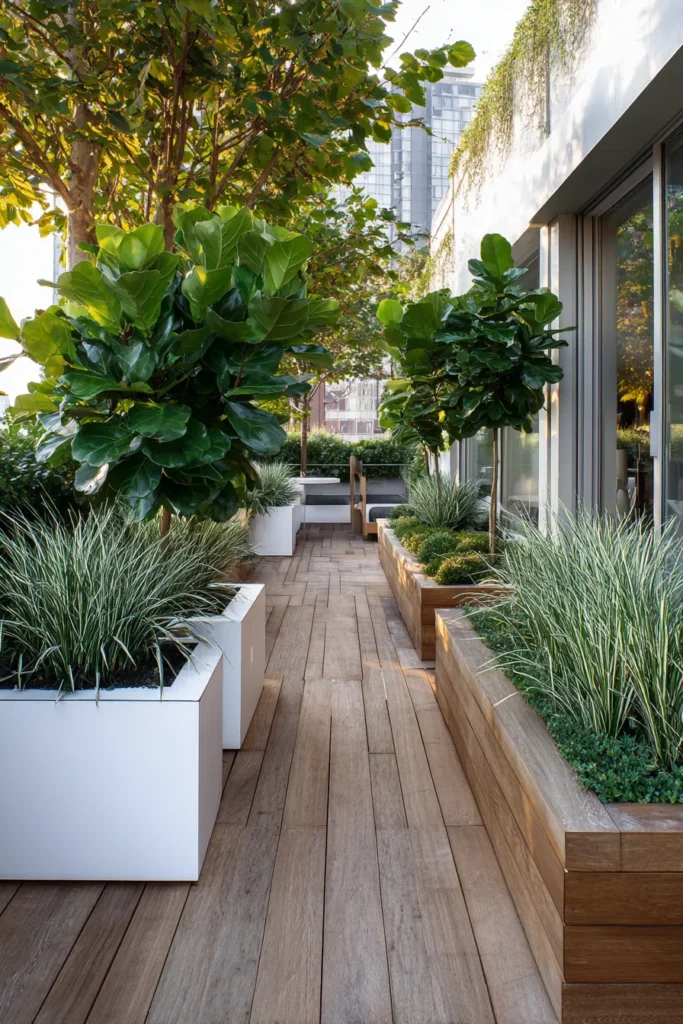 A sleek wooden deck winds through carefully placed planters filled with lush greenery and small trees. The clean lines of the deck contrast beautifully with the organic shapes of the plants, creating a calm and balanced outdoor layout. Everything feels intentional and uncluttered while still being full of life.