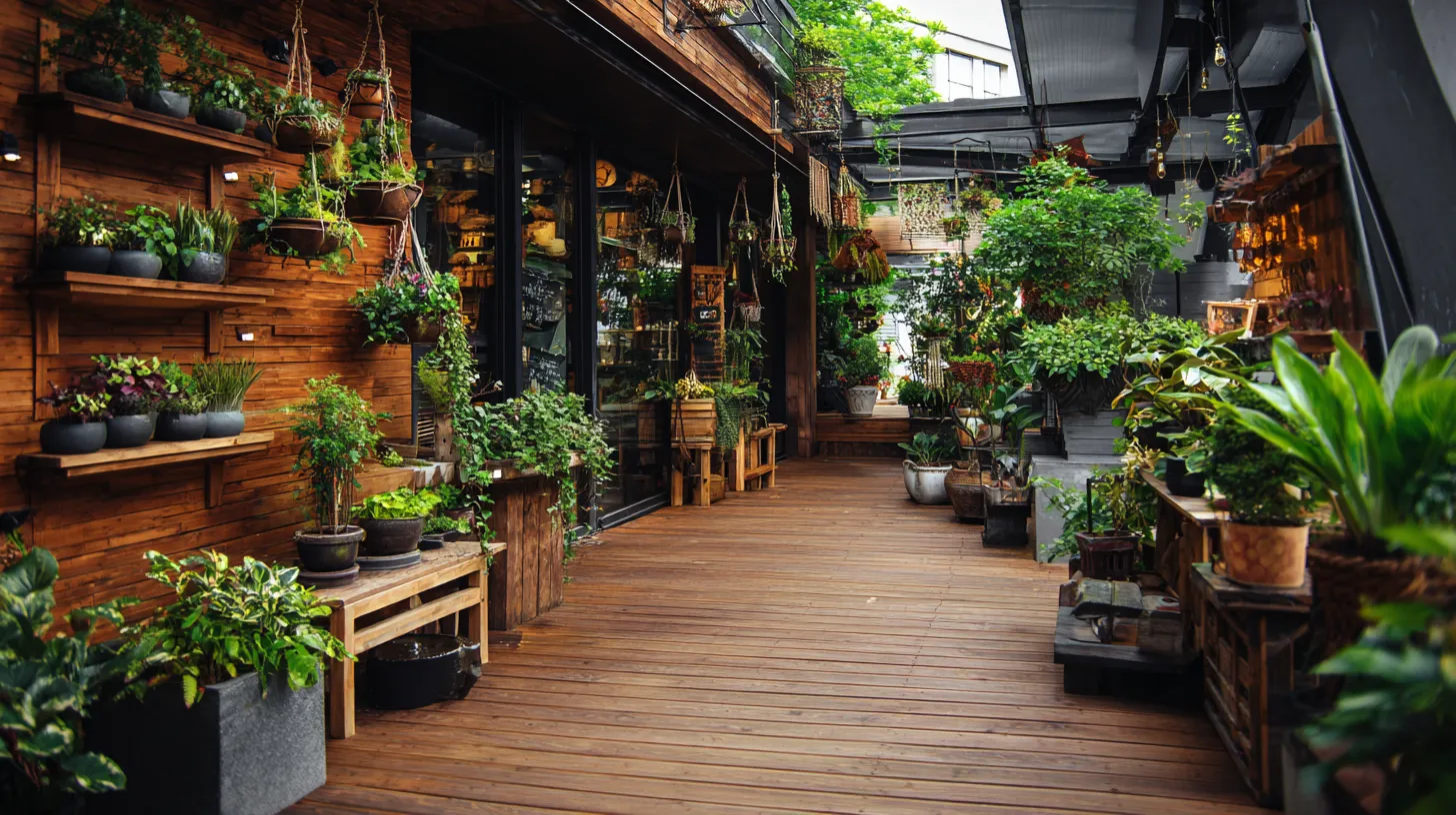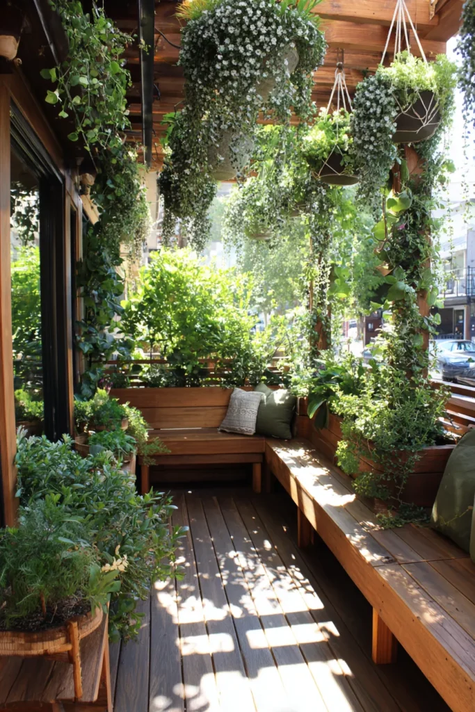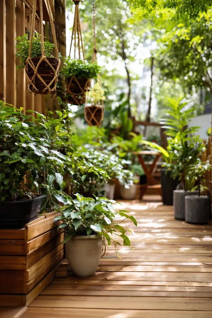 This deck features rich wooden flooring lined with layered potted plants and delicate hanging planters that soften the vertical space. The greenery varies in height and texture, creating a cozy, collected look that feels natural rather than overly styled. Sunlight filters through the leaves, adding warmth and gentle contrast to the wood tones.