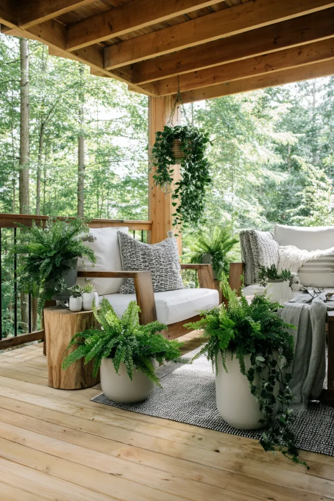 This covered deck corner uses light wood flooring, neutral furniture, and softly layered plants to create a calm and cozy setup. Potted greenery surrounds the seating area, adding texture without overwhelming the space. The roof overhead adds warmth and makes the deck feel usable in any season.