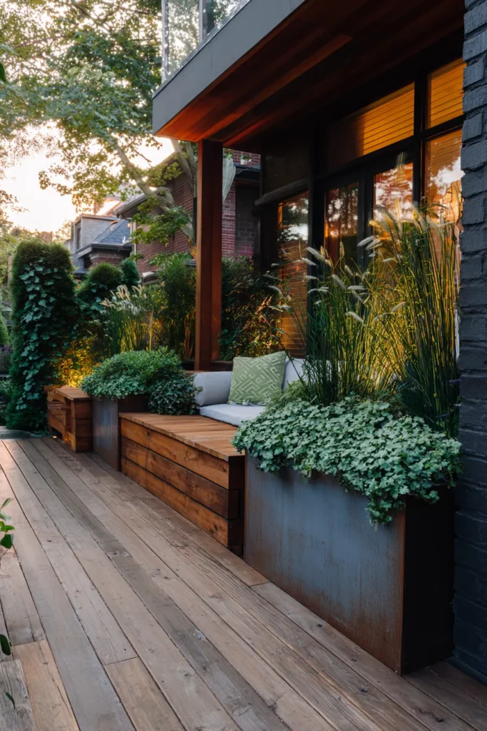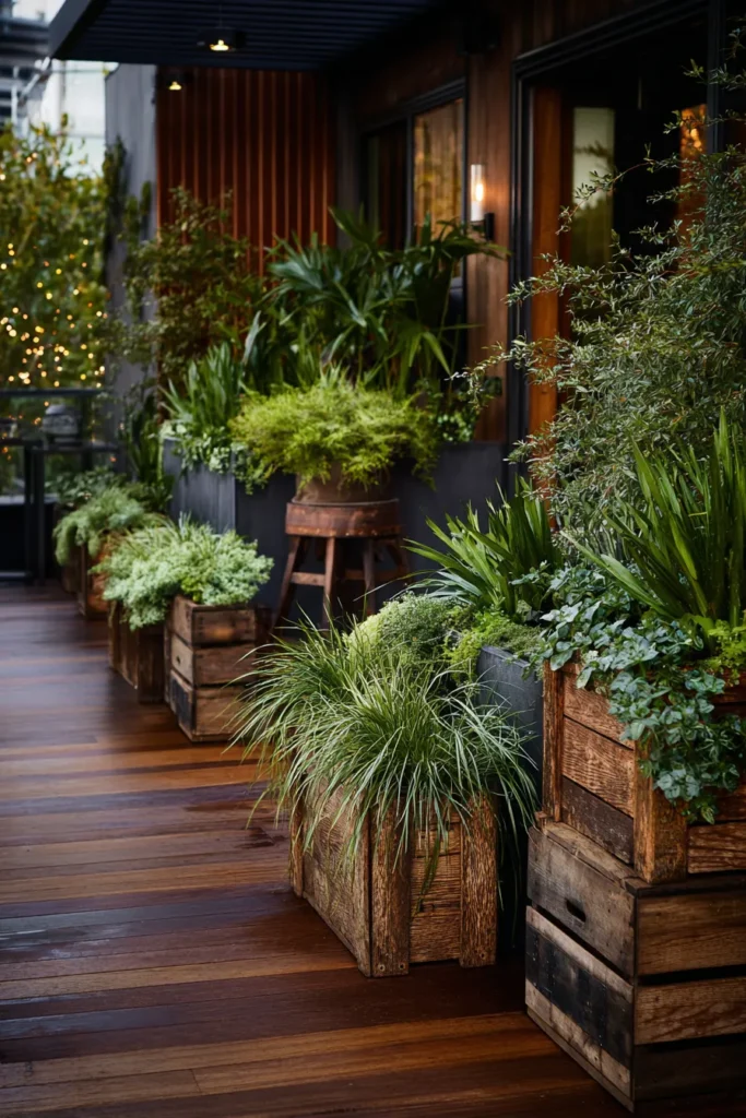 This deck uses raised wooden planters packed with greenery to frame a narrow seating area. The mix of textures and plant sizes gives the space depth, while the wood surfaces keep everything feeling warm and cohesive. It feels intimate without feeling cramped.
