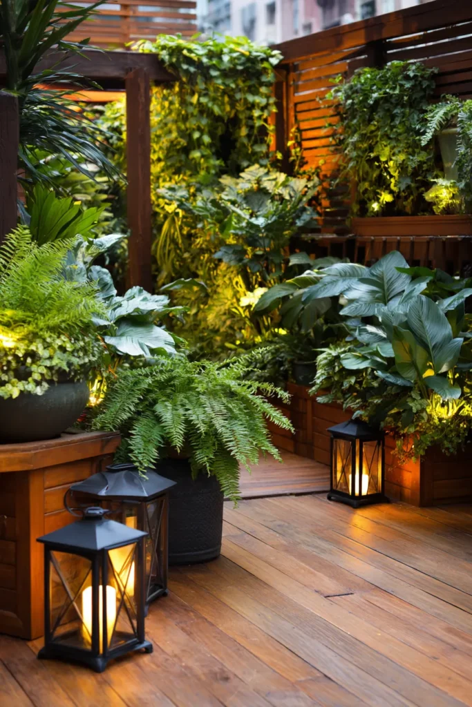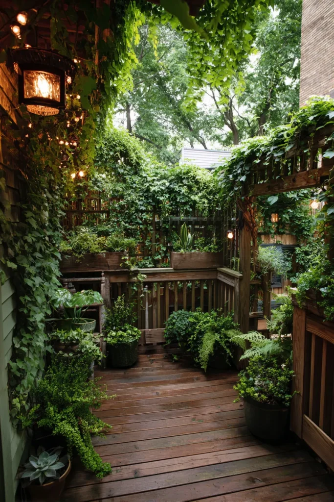 This deck feels tucked away and private, surrounded by dense greenery that climbs walls and railings. Warm lantern lighting glows softly against the wood deck, creating a cozy atmosphere that feels magical and intimate. The plants wrap the space in layers, making it feel like a secret garden.