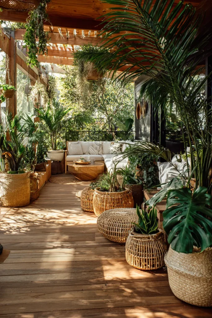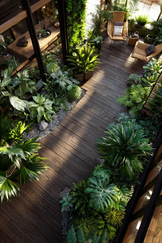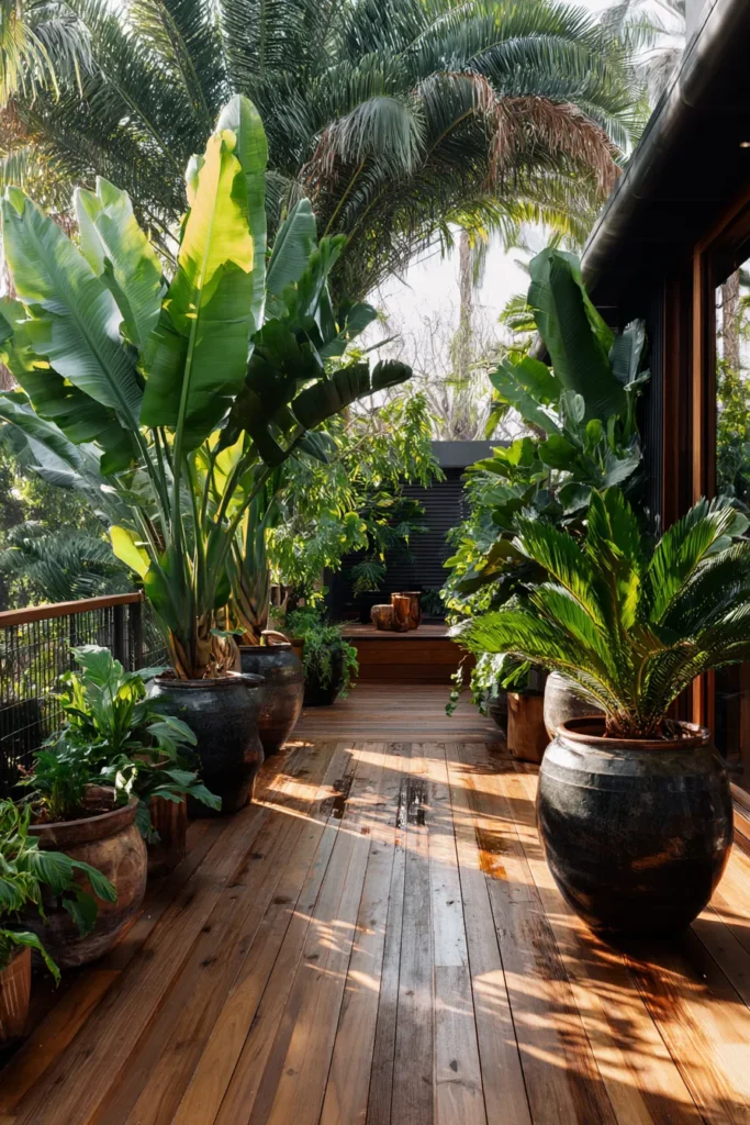 This deck features warm wooden flooring paired with oversized dark planters filled with lush tropical plants and tall leafy greens. The plants are arranged along the edges to frame the walkway, creating a rich and layered look that feels vibrant yet grounded. Natural light filters through the foliage, enhancing the warm tones of the wood and giving the space a relaxed outdoor rhythm.