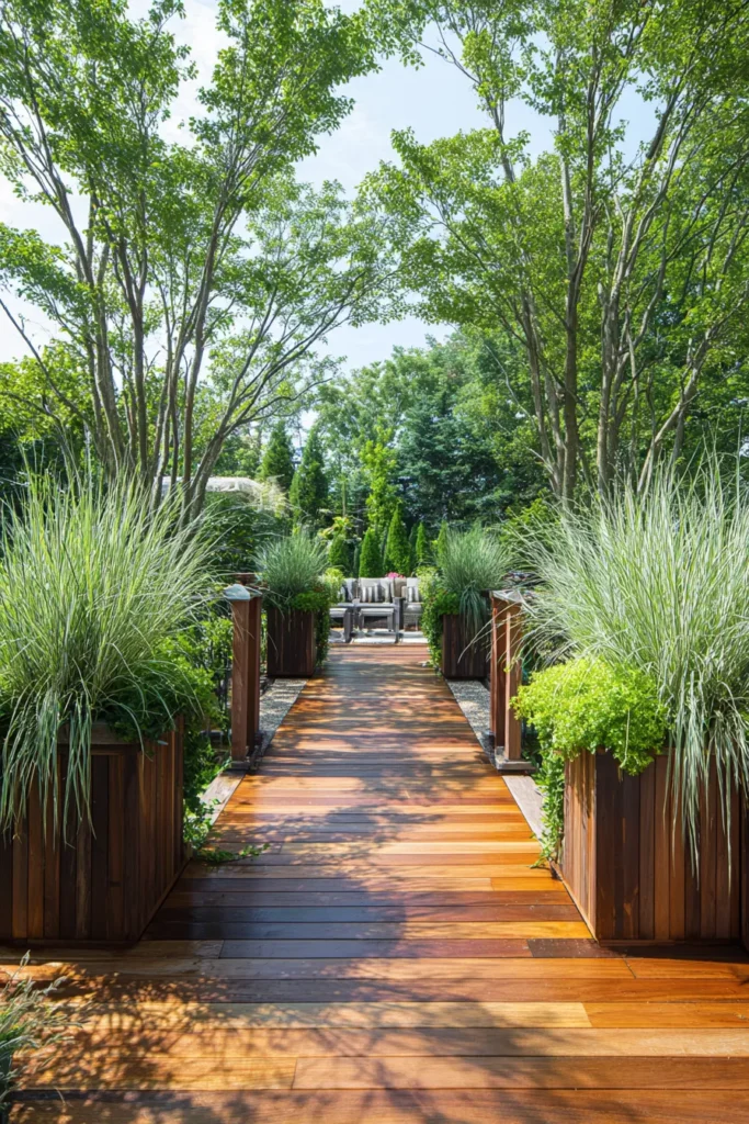 This deck features tall, modern planters filled with grasses and greenery lining a straight wooden walkway. The plants add height and structure while still feeling lush and natural. Sunlight hits the deck beautifully, highlighting the warm wood tones and fresh green colors.