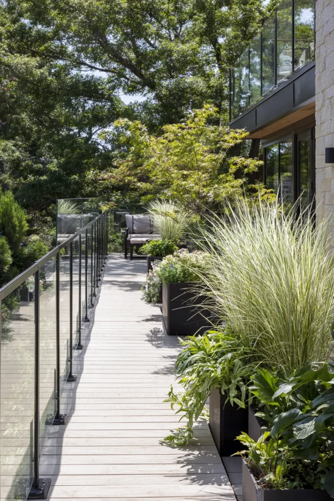 This long and narrow deck makes smart use of space by lining both sides with tall planters filled with leafy plants and textured grasses. The warm wood decking draws the eye forward while the greenery softens the clean lines of the surrounding architecture. Natural light filters in beautifully, giving the space a fresh and airy look despite its compact footprint.