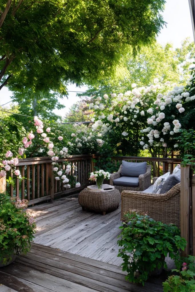 This deck features a cozy seating area framed by flowering plants and lush greenery that spills over railings and planters. The wooden deck grounds the space while the plants add softness and charm. Dappled sunlight filters through the leaves, creating a gentle and inviting atmosphere.