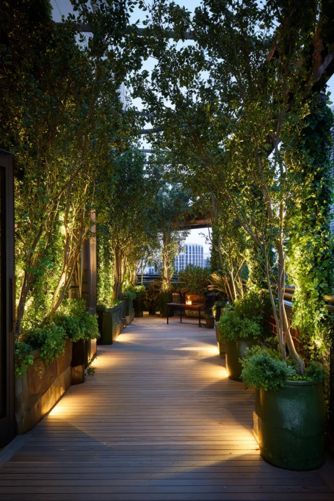This deck walkway is lined with planters and trees that are softly illuminated by warm ground lighting. The wooden deck glows gently at night, while the greenery creates depth and a sense of calm. The path feels serene and beautifully styled.