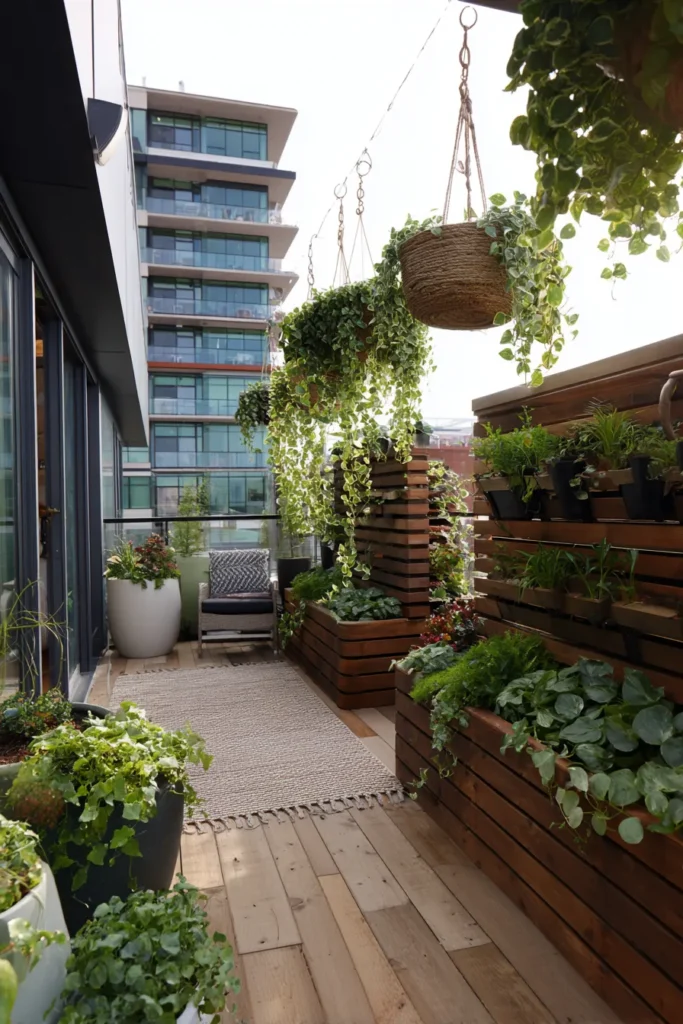 What makes this one stand out for me is how balanced it feels. The hanging plants draw your eyes upward, while the layered planters keep everything grounded and cozy. It is such a smart way to bring nature into an urban setting without overwhelming the space.