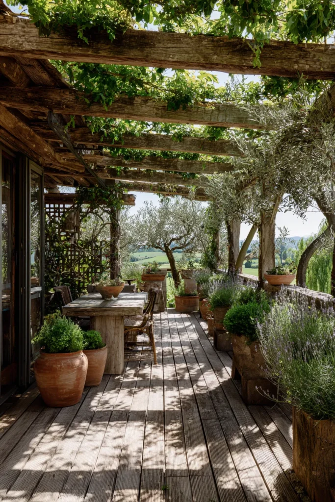 This deck features a wooden pergola covered in greenery, paired with natural wood decking and earthy potted plants. The plants frame the space beautifully, creating a garden like setting that feels both rustic and refined. Dappled sunlight adds texture and warmth across the floor and surrounding surfaces.