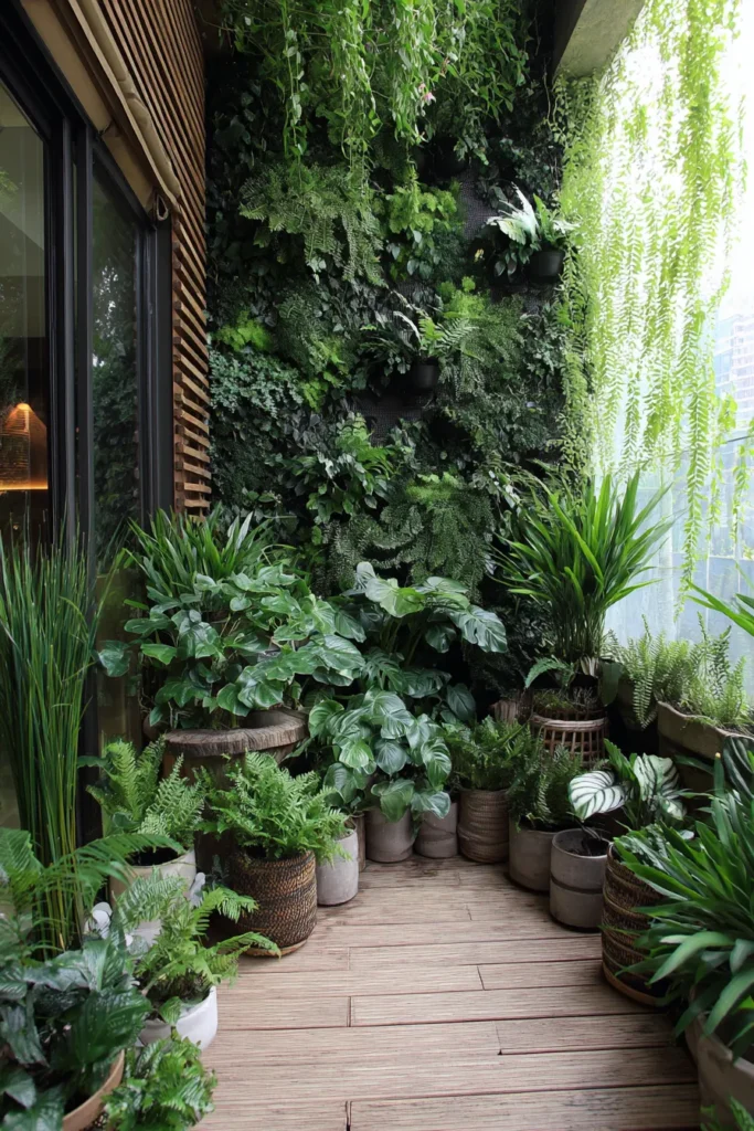 This compact deck is completely embraced by layers of potted plants in various sizes and textures. Wooden decking anchors the space while greenery climbs and fills every available corner. The result feels immersive, cozy, and wonderfully green.