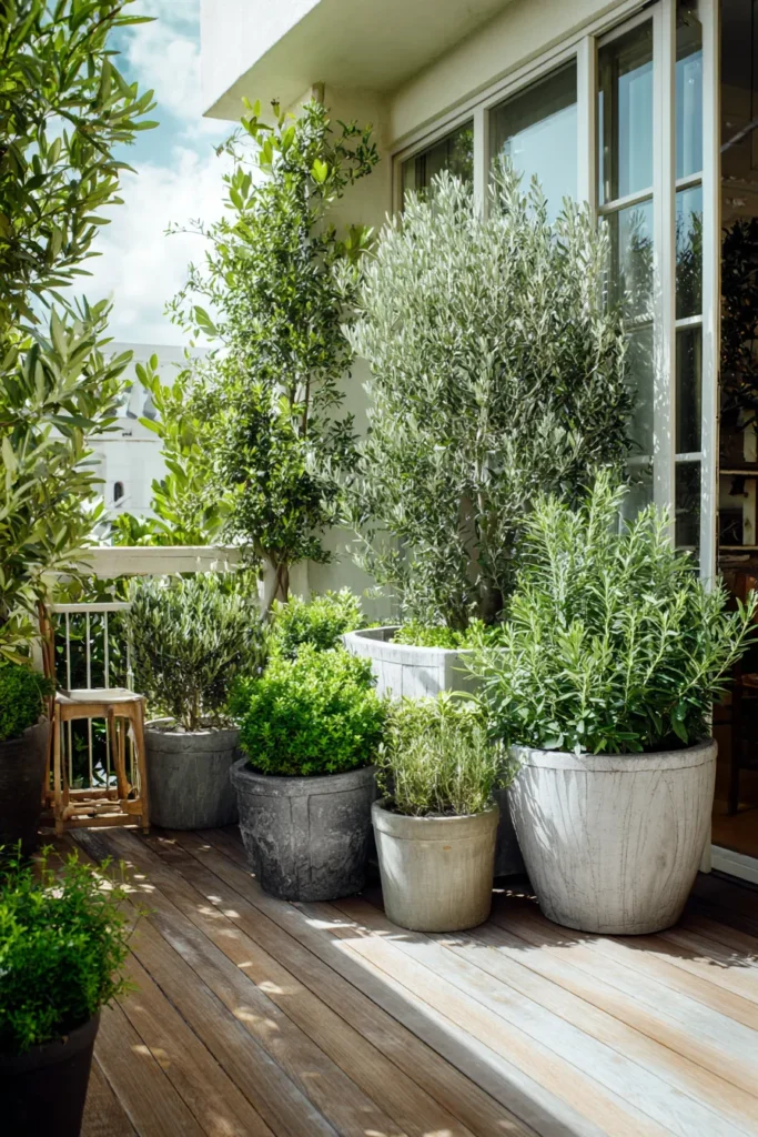 This deck features light wood flooring paired with soft neutral planters filled with structured greenery and small trees. The plants are arranged neatly along the edges, allowing the deck to feel open while still lush. Natural light reflects beautifully off the pale surfaces, giving the space a fresh and calming feel.