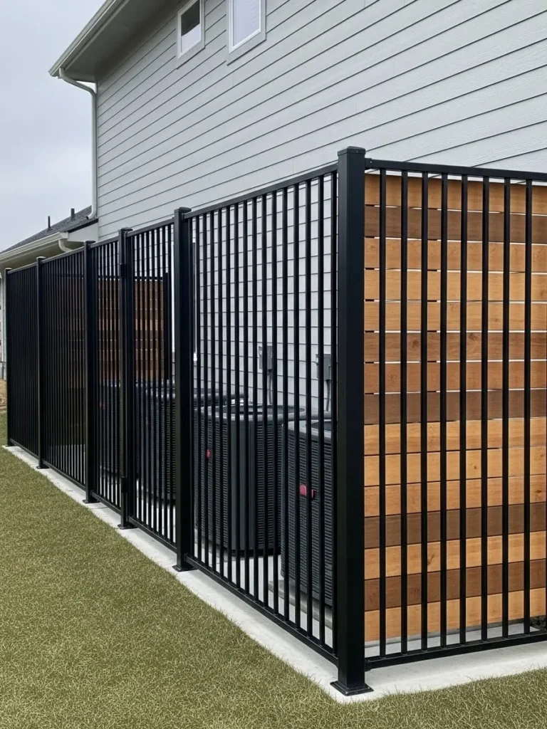 This fence uses clean black horizontal slats to block the view of AC units along a narrow side yard, with simple and consistent lines that create a calm and organized look while blending easily with modern homes and working well in tight spaces.