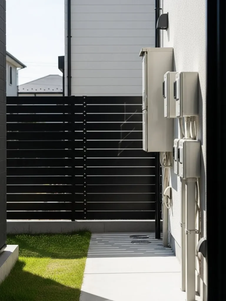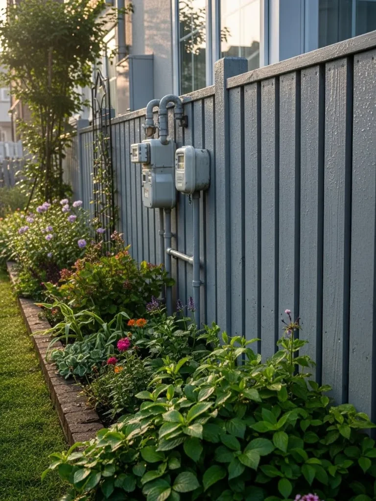 This fence uses painted vertical panels in a muted tone to conceal exposed utility lines along the side of a home, while low plants soften the base and help everything blend into the garden area.