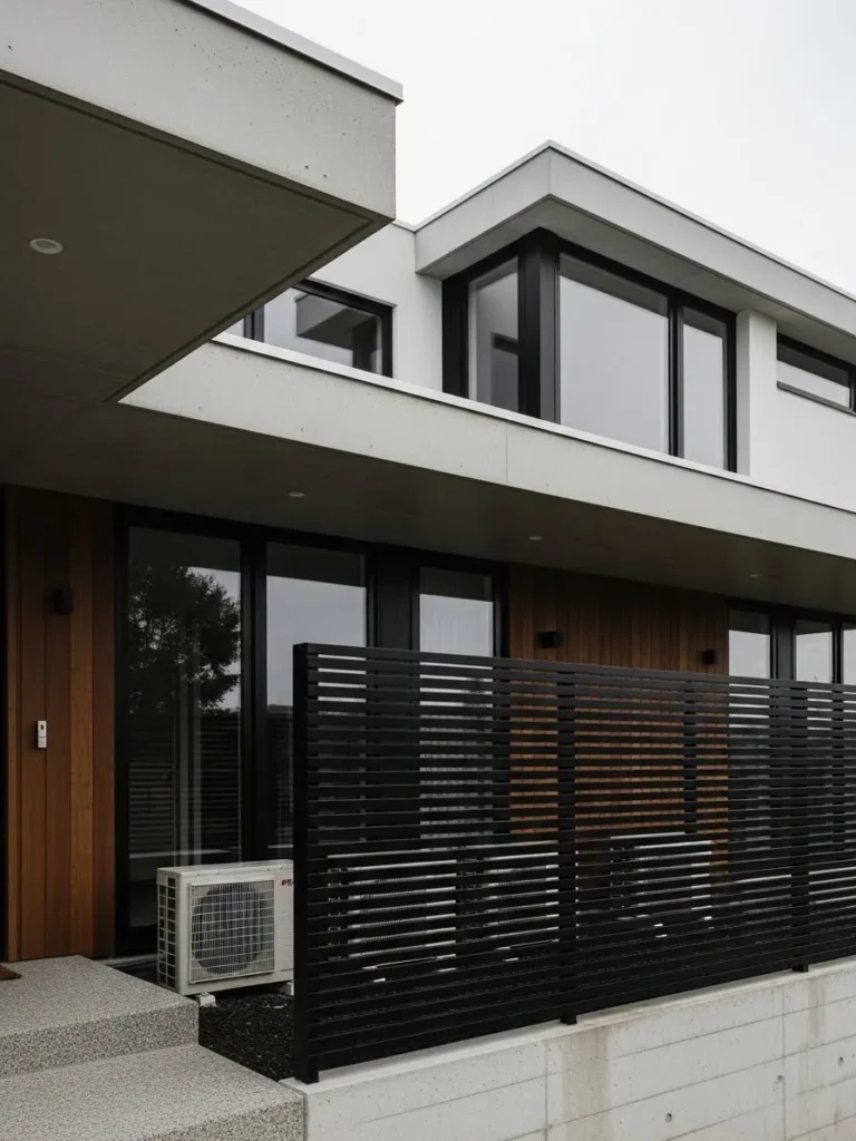 This design features a black horizontal slatted fence tucked neatly beneath a modern roof overhang, creating a clean enclosure that hides an outdoor AC unit while matching the sharp lines of the home’s architecture and keeping the space looking structured and intentional.