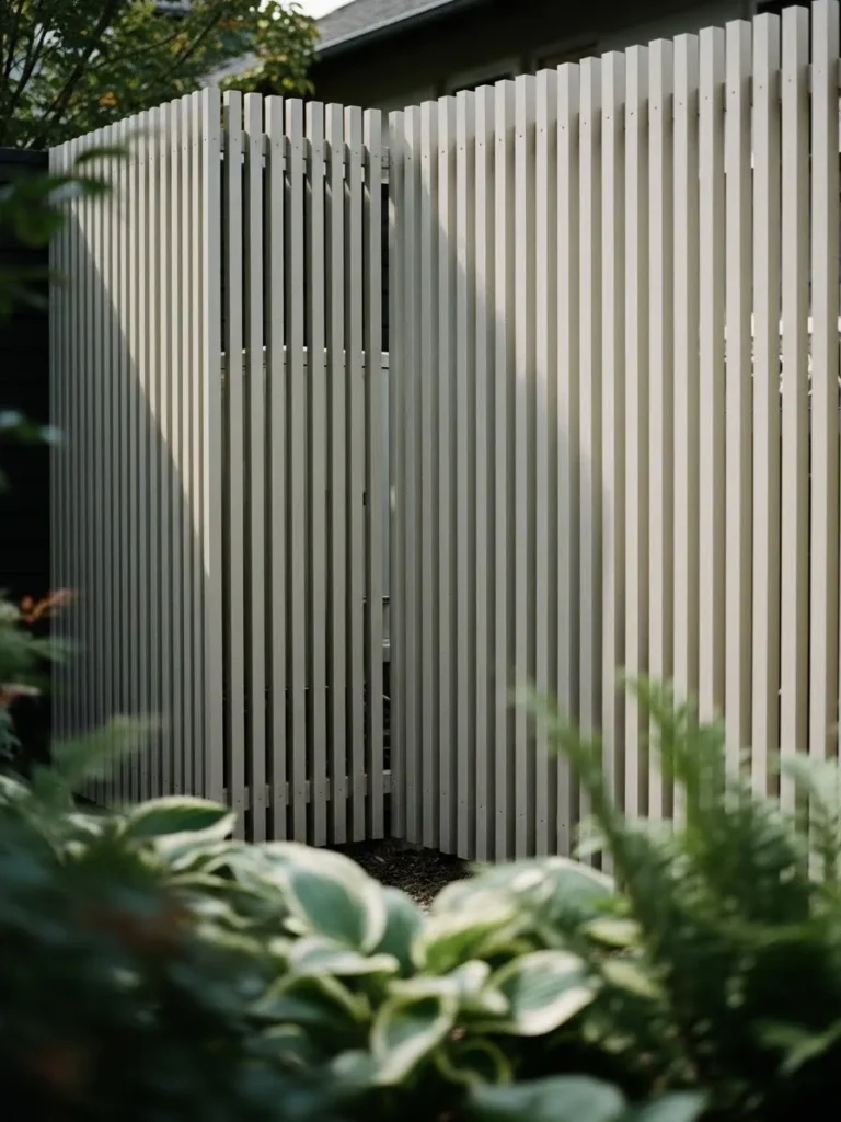 This fence uses slim vertical slats in a light neutral tone to create a tall privacy screen that hides utilities, with soft plants and greenery framing the base so the structure feels calm and integrated into the garden.