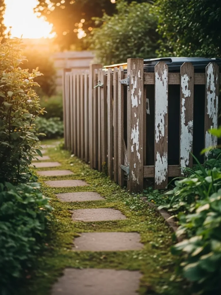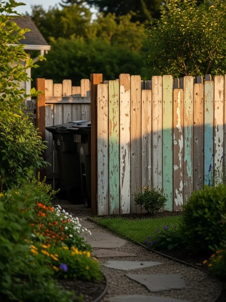 This design shows a rustic fence made from mismatched wood planks with faded paint tones, creating a casual enclosure that hides garbage bins while adding personality and charm to a garden path.
