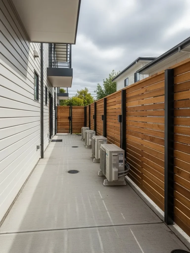 This fence runs along a side walkway using warm horizontal wood slats to hide multiple AC units, keeping the path feeling open while adding texture and warmth to an otherwise narrow space.
