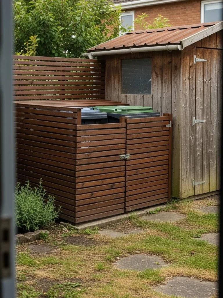 This design uses a compact wood enclosure with horizontal slats to hide garbage cans beside a small shed, blending storage into the yard in a way that feels cohesive and practical.