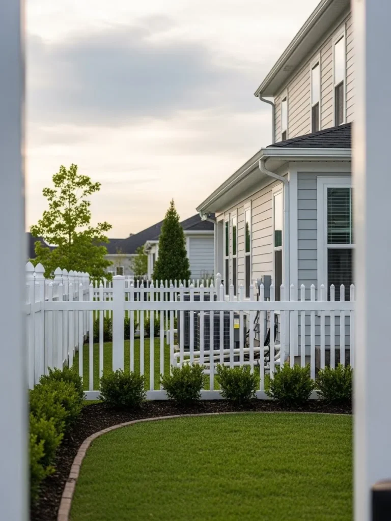 This design shows a traditional white fence that quietly wraps around a side yard area, creating a clean screen that keeps garbage cans out of sight while still matching the classic style of the home and maintaining a bright and tidy look.