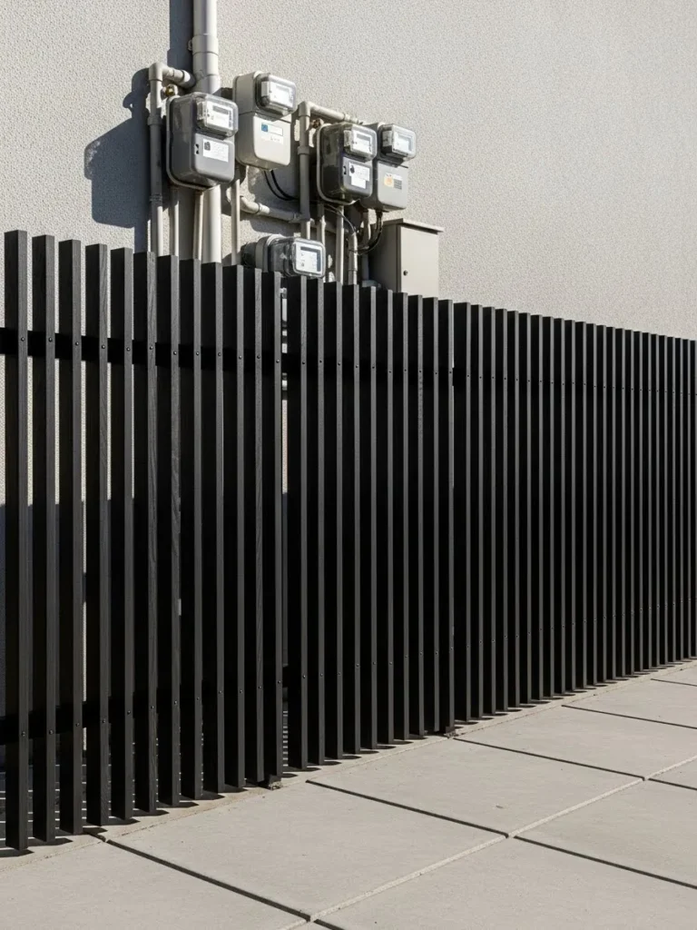 This design features a bold black vertical slat fence that hides exposed utility meters, creating a strong and modern look that feels clean and architectural while still allowing airflow.