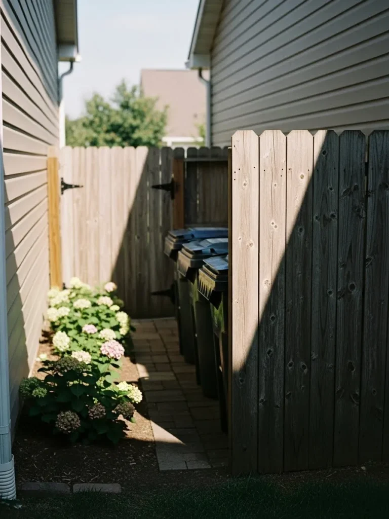 This fence runs the length of a narrow alley using tall vertical boards to hide bins and utilities, turning a cluttered path into a clean and organized space.