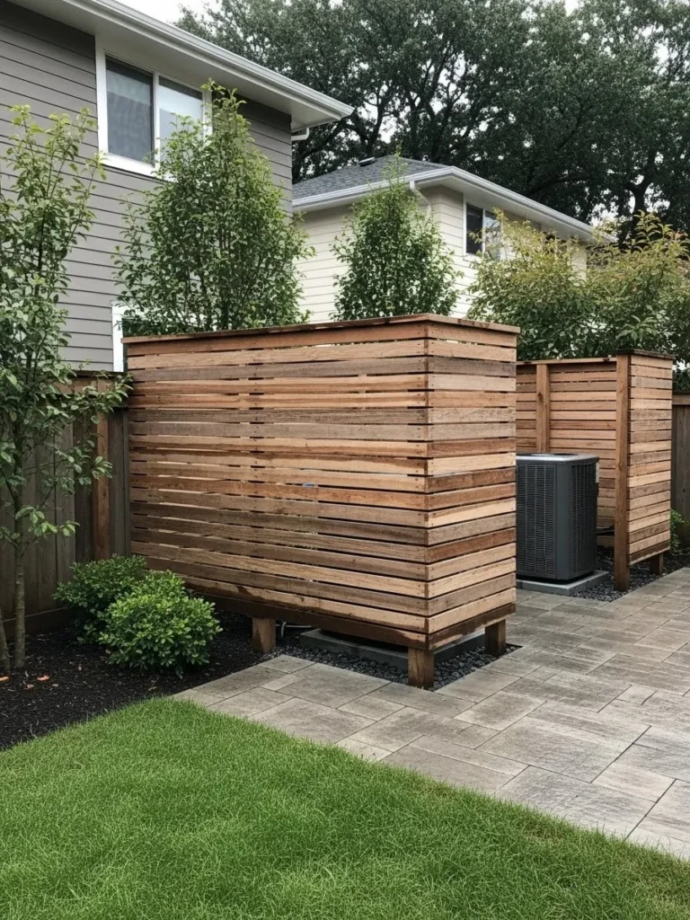 This design wraps an AC unit in warm wood fencing that feels almost like a small outdoor room, with vertical boards that offer privacy while still letting the unit breathe and keeping the area visually calm.