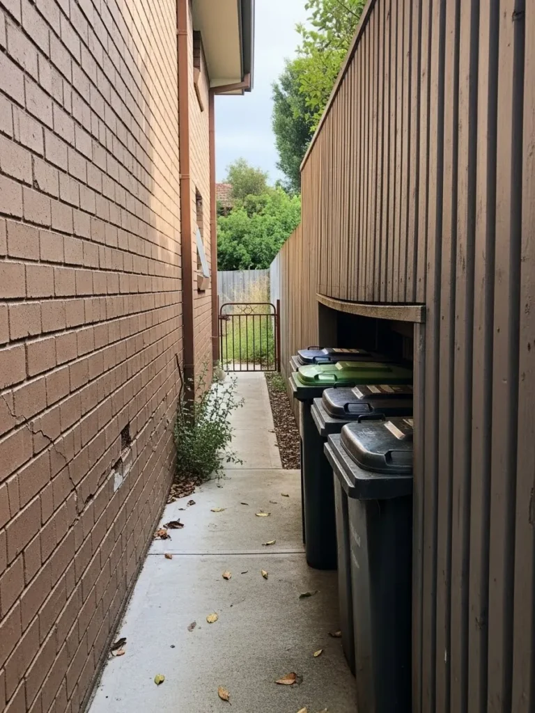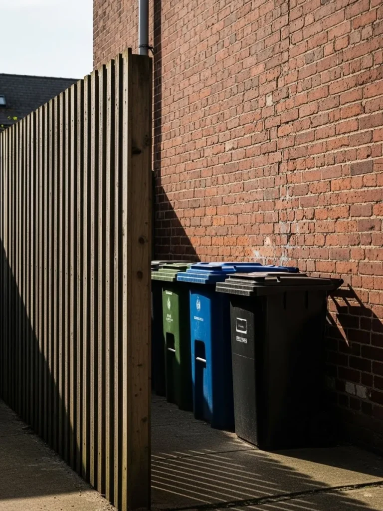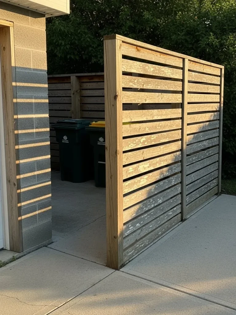 This setup uses tall vertical wood slats placed close to a brick wall to hide multiple garbage bins in a narrow alley, creating privacy while making smart use of limited space and keeping the area looking tidy instead of cluttered.