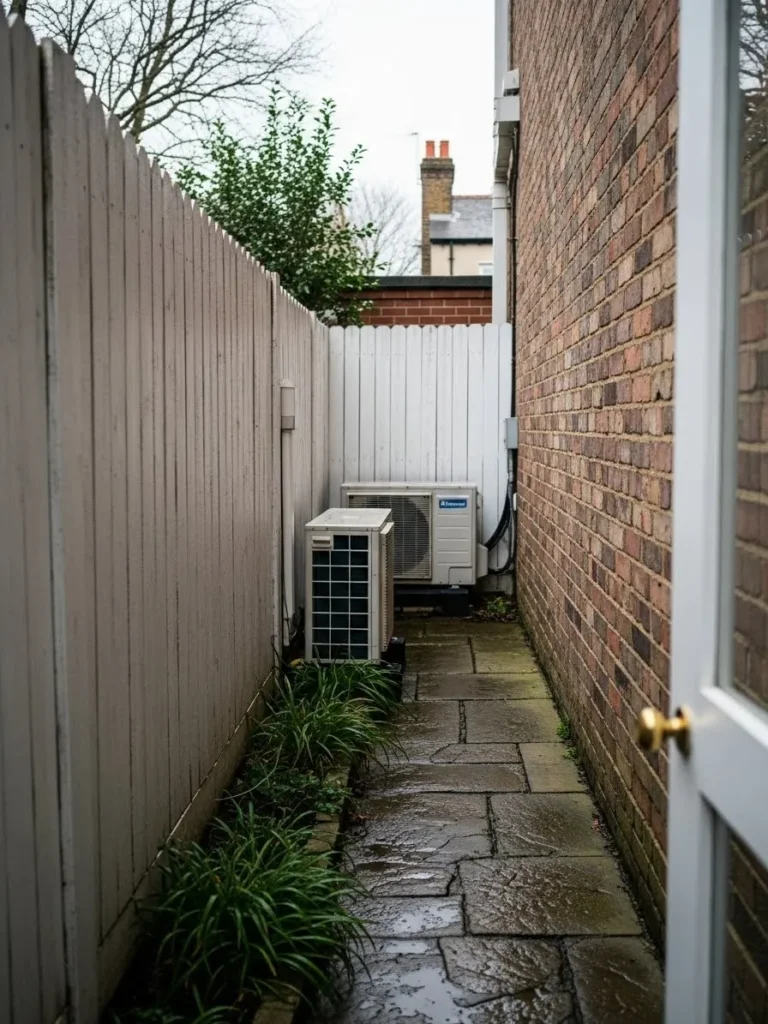 This fence sits quietly between two buildings using neutral tones and vertical panels to hide an outdoor AC unit, keeping the area clean and functional without drawing attention to itself and working especially well in narrow passages.