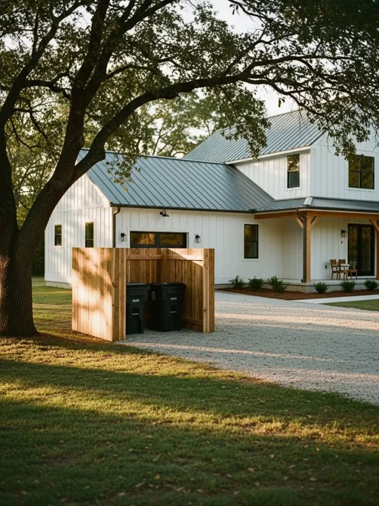 This design uses warm wood panels to create a box style enclosure near a farmhouse style home, hiding garbage cans while still feeling open and welcoming and blending beautifully with the surrounding yard and natural setting.