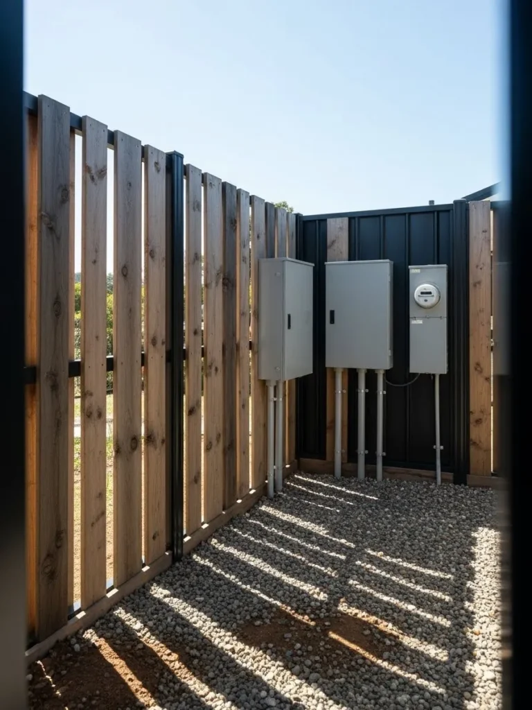 This fence features tall vertical wooden slats arranged to create a private enclosure for electrical panels and equipment, with spacing that allows light and airflow while still blocking the view and keeping the look modern yet grounded.