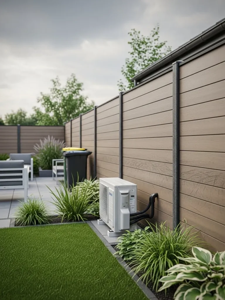 This fence uses smooth composite panels in soft neutral tones to hide an outdoor AC unit, paired with manicured grass and low plants that give the whole space a calm and finished feel, and the clean lines make it blend seamlessly into a modern backyard layout.