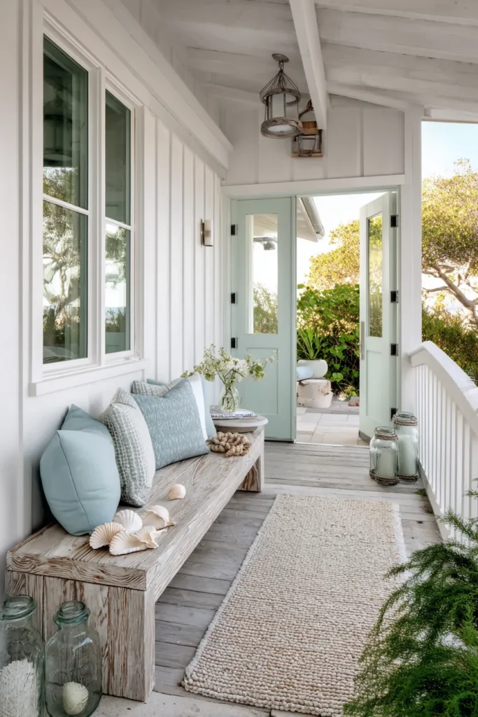 This front porch features light siding, a built in bench, and soft neutral cushions that instantly create a calm and welcoming look. Simple textures like woven rugs and pale wood accents keep the space feeling airy. Greenery tucked along the edges adds freshness without crowding the walkway.