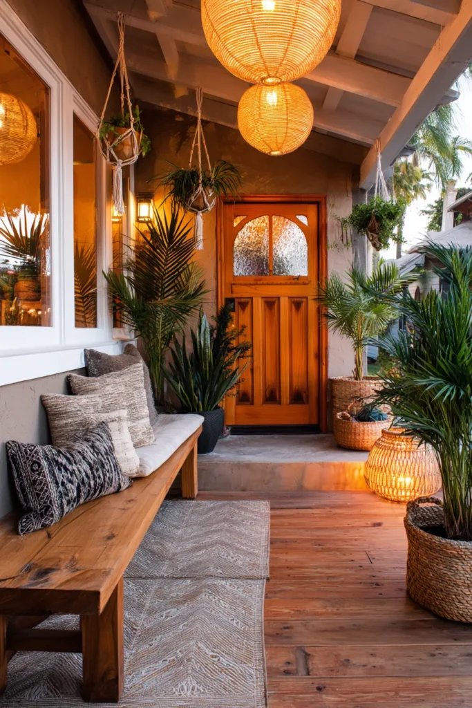 This front porch uses rich wood tones, a welcoming front door, and soft layered seating to create an instantly inviting feel. Neutral cushions, simple planters, and warm lighting work together to soften the space without making it feel crowded. The natural textures make everything feel grounded and calm.