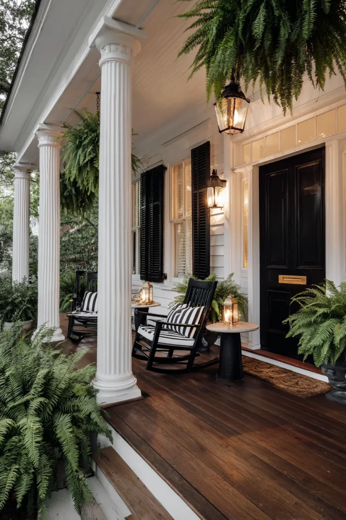 This front porch features white columns, dark doors, and cozy seating arranged for conversation. Wooden floors add warmth while potted plants bring in natural texture. The layout feels balanced and timeless.