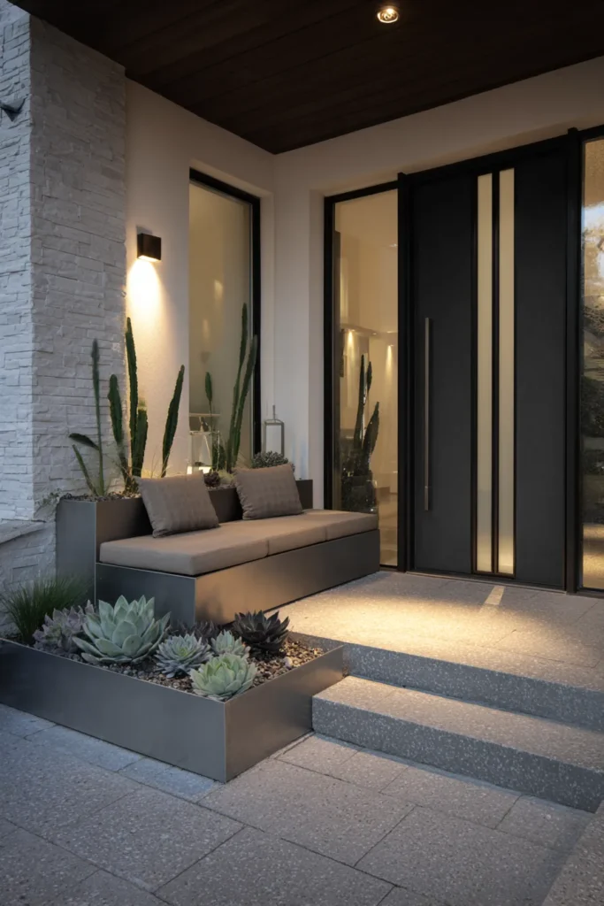 This porch combines clean architectural lines with soft lighting and simple plant styling. Wide steps, neutral materials, and subtle greenery create a calm and balanced look. The lighting highlights the structure while keeping the mood warm.