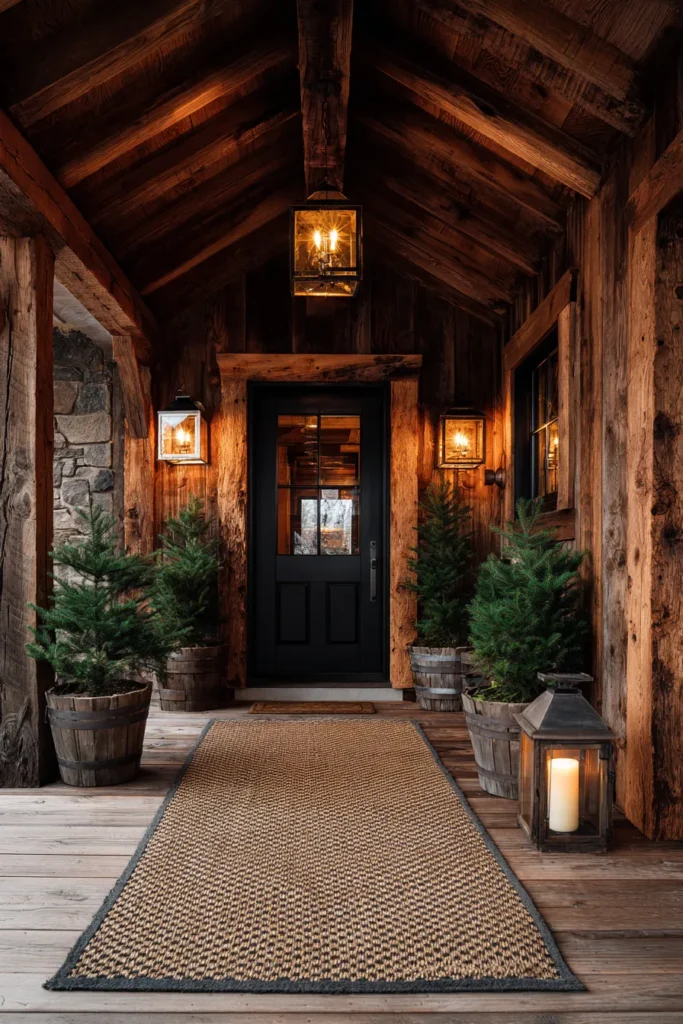 This porch uses wood walls, a long runner rug, and warm lighting to create a snug and intimate entry. Natural materials and simple decor keep the focus on texture and warmth. The narrow layout feels intentional and cozy.