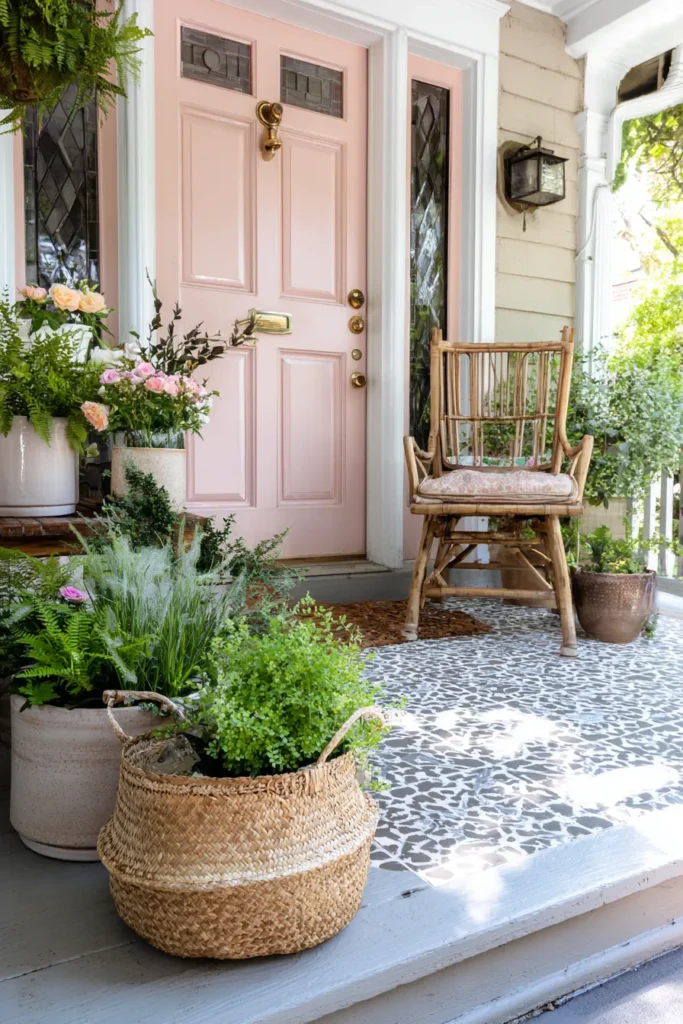 Soft Pink Door Porch With Natural Accents