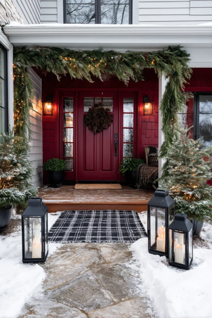 This front porch uses a deep red door as the focal point, framed by greenery, lanterns, and seasonal decor. Stone flooring and layered textures keep the look grounded and cozy. The symmetry makes the space feel polished and intentional.