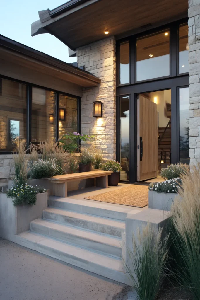 This porch keeps things simple with clean concrete steps, minimal planters, and subtle lighting. Neutral tones and sharp lines create a modern look without feeling cold. The space feels open and uncluttered.